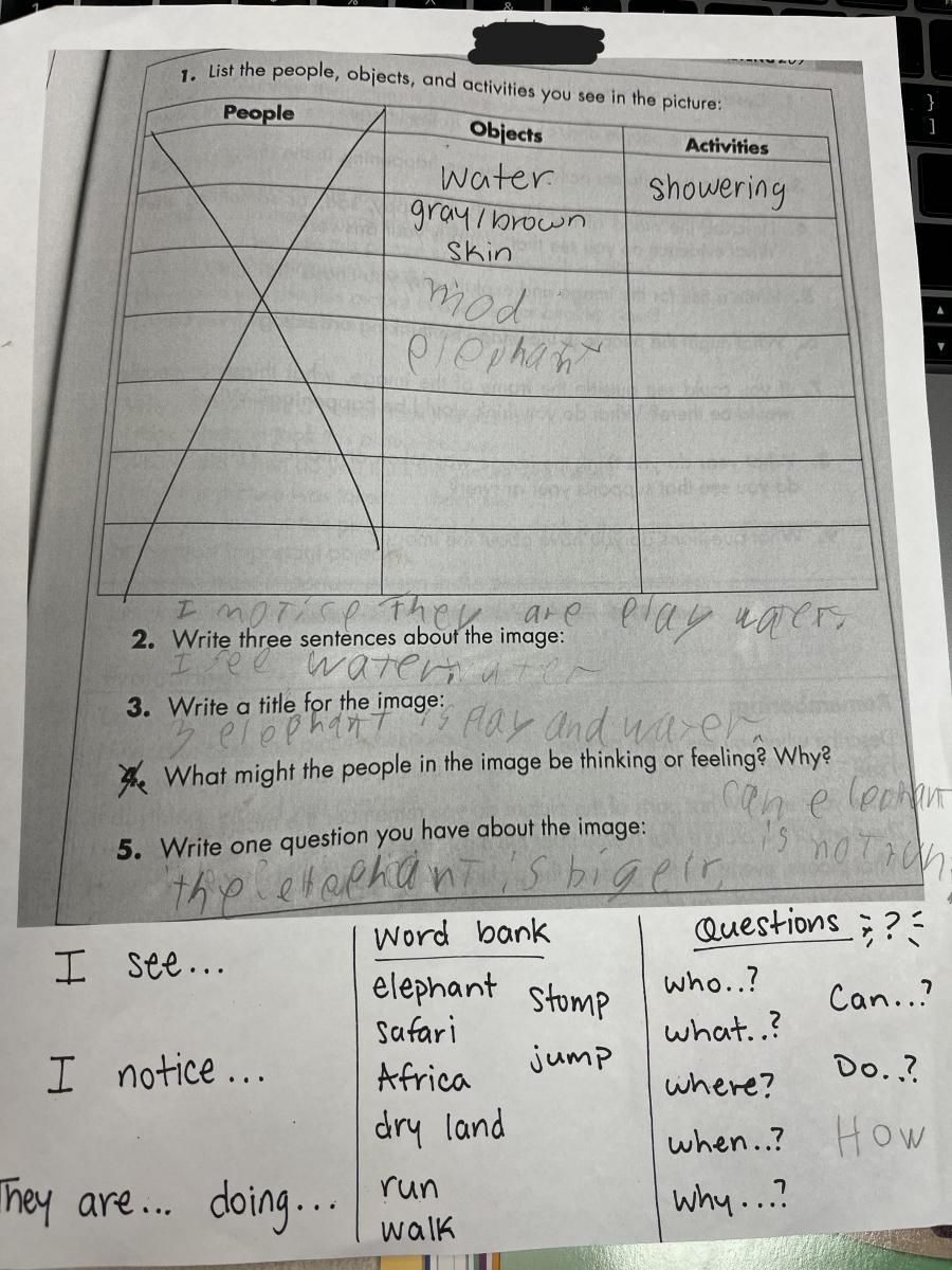 Objectives(s): Content Objective: SWBAT analyze photos and describe what they see with at least 2 examples. Language Objective: SWBAT complete the graphic organizer by examining the images, using sentence frames and their background knowledge of elephants with 80% accuracy. Cultural Objective: SWBAT find a connection and state an animal they have seen or know in their home language with a minimum of one example.