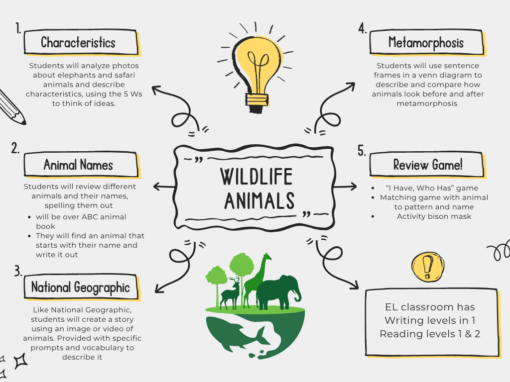Welcome to the Thematic Unit "Wildlife Animals" designed for ESL students, grades 4-5! This group specifically was low levels 1-2 as my focus, but there were some intermediate students as well that were independent in working, so accommodations were pointed out to support all their needs. This unit focused primarily on the use of images in reading and writing, specifically in the backgrounds of different animals. Students were to practice their reading and writing skills in every lesson by learning standards that support the ELPA test, such as describing and identifying images, comparing and contrasting, picture storytelling, and writing complete sentences.